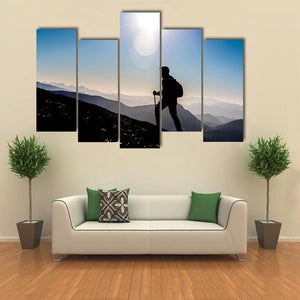 Step Into Success features a silhouetted hiker with a backpack and trekking pole against mountain peaks and a daytime sun, arranged with depth and a rule-of-thirds composition. Rendered in a modern, minimalist palette of blue, black, white and gray, it offers an epic, adventurous yet serene focal point for modern living spaces and home offices.