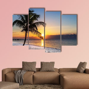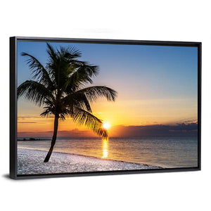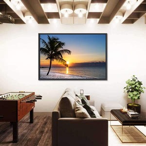 Sunrise At Key West shows a tropical beach scene with a palm tree, white granular sand, and sunlight reflecting on the ocean. The realistic landscape blends blues with warm oranges and yellows for a serene, peaceful mood. It suits coastal homes or modern rooms looking for calm wall decor.