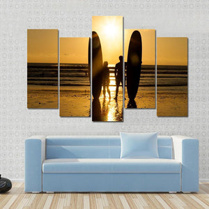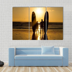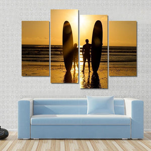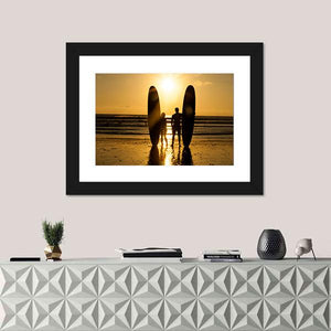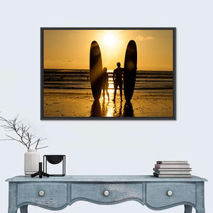 This beautiful canvas art captures a surfer couple silhouetted against a stunning sunset on the beach. The warm golden and orange tones create a romantic and tranquil atmosphere, perfect for any coastal-themed décor.