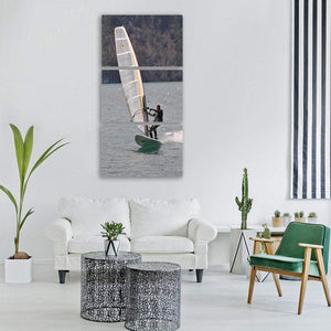 A windsurfer in action, captured with sail and water spray against a tree-covered mountain to convey an active, dynamic yet serene mood. Rendered in a realistic nature-photography style with a blue, gray, white and green palette, it fits modern room decor and sports-themed spaces.