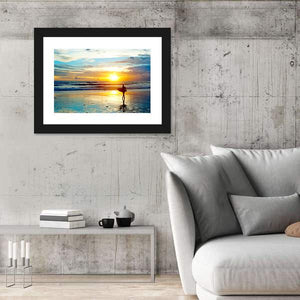 This canvas art features a serene scene of a surfer against the vibrant backdrop of a Bali sunset. The tranquil palette of blues, oranges, and yellows captures the beauty of the ocean and beach, with reflections on the wet sand adding depth to the artwork.