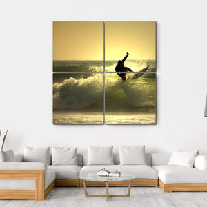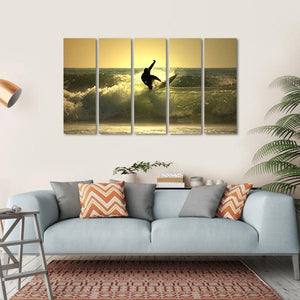 This canvas art captures the dynamic moment of a surfer mid-air against a breathtaking sunset. The vibrant palette of gold, blue, and green creates a serene yet energetic atmosphere, making it a striking addition to any space.