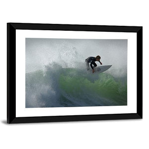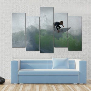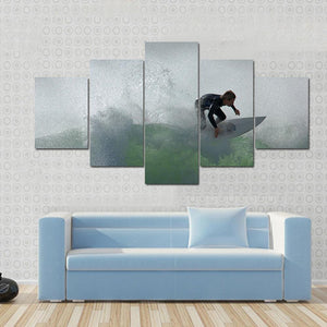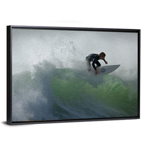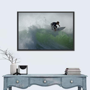 This dynamic canvas art captures the powerful essence of a surfer racing through waves, with water spray adding to the excitement. The green and gray palette evokes the raw beauty of nature, making it a striking addition to modern walls.
