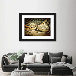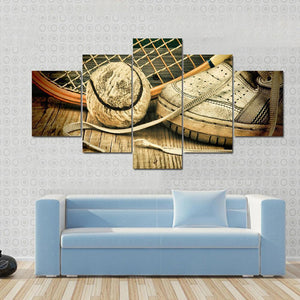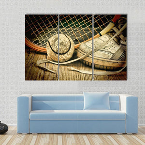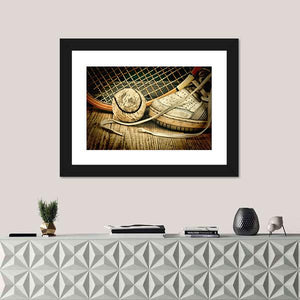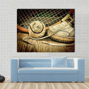 This canvas art features nostalgic elements of a worn tennis ball, a rustic racket, and aged sneakers, evoking memories of spirited games. Its vintage style and warm brown and green palette make it a fitting addition to any sports enthusiast's décor.