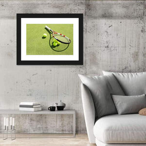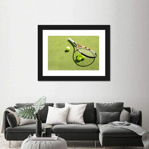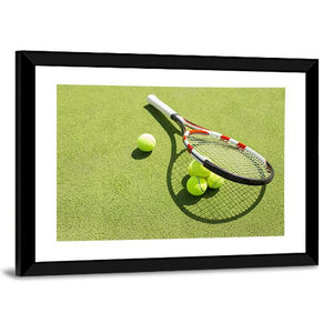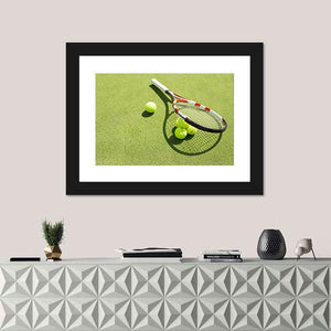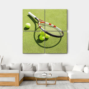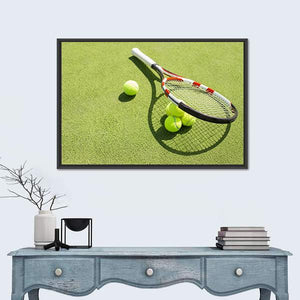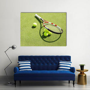 This vibrant canvas wall art features a tennis racket and balls in a sporty, energetic style. The top-down perspective and lively color palette of green, white, red, and yellow bring a dynamic feel to any room.