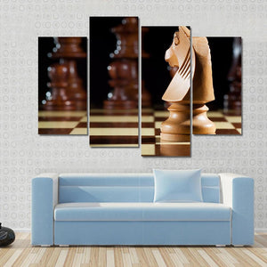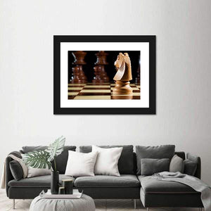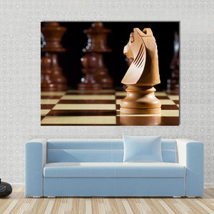 This canvas art features a close-up of a wooden chess knight on a chessboard, surrounded by blurred chess pieces. The combination of rich browns, blacks, and whites creates a focused and strategic vibe, perfect for elevating any room's decor.