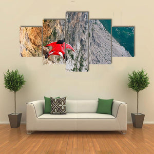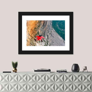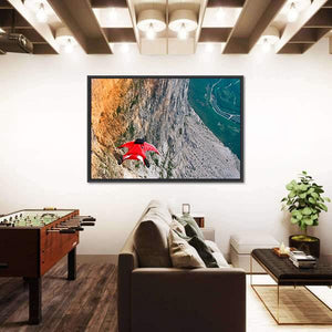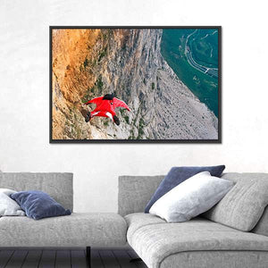 This canvas art captures an adventurous wingsuit flyer leaping off a sheer rock face, surrounded by majestic mountains. With its vivid palette of red, orange, and blue, it brings an epic sense of daring to any space.
