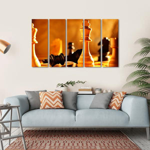 This canvas art captures the intense moment in a chess match, highlighting a white king standing tall alongside a black king on its side. With dramatic lighting and a close-up view, the piece evokes a focused atmosphere, making it a captivating addition to any space.