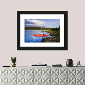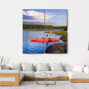 Experience the serene beauty of a kayaker gliding across a tranquil lake, surrounded by lush forests and a vivid sky. This canvas wall art captures a peaceful sunset scene, inviting calm and tranquility into your space.