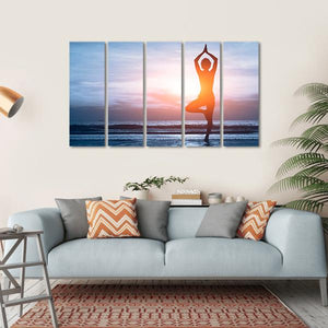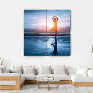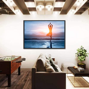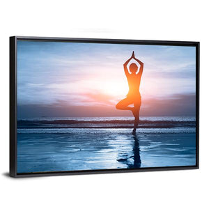 This canvas art captures a serene moment of a woman practicing yoga at the beach during sunset. The tranquil silhouette reflects the peaceful harmony of nature, featuring a beautiful palette of blue, orange, and purple that complements modern and minimalist décor.