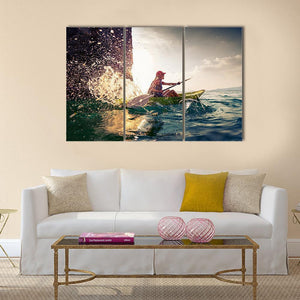 This vibrant canvas art portrays a silhouette of a kayaker against an exhilarating ocean backdrop. The dynamic composition, highlighting splashes of water and sunlight glinting off the sea, brings a sense of adventure to any space.