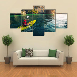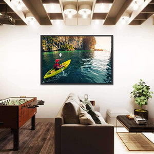 This canvas art captures a woman kayaking amid rocky cliffs with sunlight dancing on the water. The adventurous and peaceful scene is filled with vibrant blues, greens, and yellows, creating a warm, sunny atmosphere.