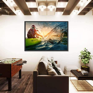 This vibrant canvas art features a dynamic scene of a young kayaker paddling through rippling water at sunset. The energetic palette of greens, blues, and oranges captures the spirit of adventure and serenity, making it a captivating addition to any nature lover's collection.
