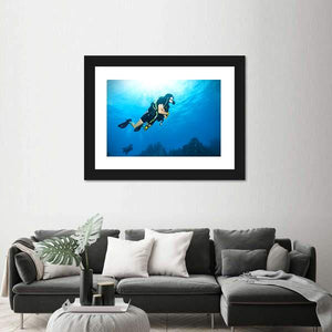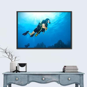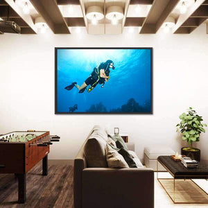 Dive into the tranquil world of scuba diving with this stunning canvas art featuring a young woman exploring the ocean floor. The realistic underwater scene is enhanced by vibrant blues and the warmth of sunlight filtering through water, creating an adventurous yet peaceful atmosphere.