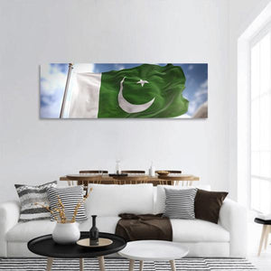 This panoramic canvas features the Pakistan flag with its crescent moon and star, shown realistically in a centered composition. The green, white and touches of blue give a proud, celebratory, patriotic mood. It works well as modern room decor in living rooms or home offices.