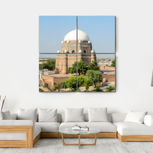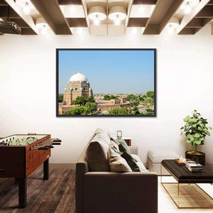 Celebrate the beauty of the Tomb of Shah Rukn-e-Alam with this captivating canvas wall art. Featuring a stunning representation of this ancient building, complete with its ornate dome and detailed brickwork, it evokes a peaceful and historical ambiance. The vibrant palette of tan, white, green, and blue brings life to any space.
