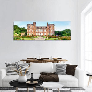 Mount Edgcumbe Panoramic Canvas shows a stone castle set among formal gardens and lush trees, rendered in a realistic style with greens, browns, blues and a clear summer sky. The scene feels serene and natural, suited to modern or nature-themed interiors.