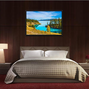 Abraham Lake in Canada presents a wide panoramic landscape of vibrant turquoise water, coniferous forest, and distant mountains in a realistic style. The scene feels serene and majestic, with blue and green tones that suggest calm depth. It fits well in modern or nature-inspired rooms.