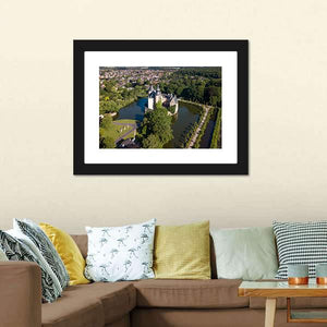 A realistic panoramic view of Castle Gemen, with the castle ringed by a moat and set among trees and nearby houses. Muted greens, blues, browns, and greys create a peaceful, idyllic mood that suits modern and classic interiors.