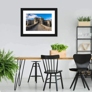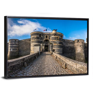 Angers Castle, France captured in a wide panoramic canvas showing a stone castle with towers, a cobblestone bridge and green moat beneath a blue sky. The photorealistic image reads historic, grand and serene, a calm daytime scene. Works well in living rooms, entryways, or any space wanting a quiet architectural focal point.
