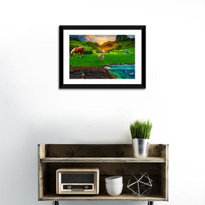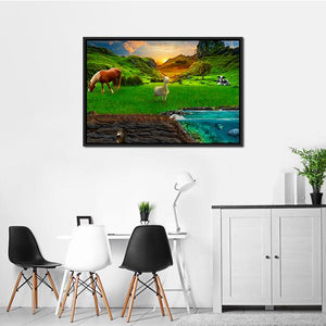 Animals In Green Meadow places a horse grazing on the left, an alpaca at center, and two cows resting on the right against rolling hills and a warm sunset. The realistic, panoramic scene uses greens, yellows and soft oranges to create a peaceful, pastoral late-afternoon mood. It fits living rooms, entryways, and modern, nature-inspired spaces.