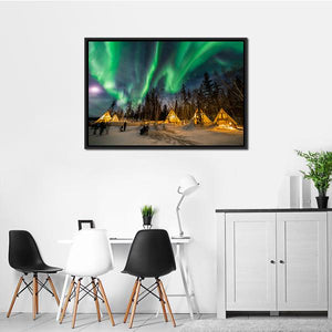 Bring the magic of the aurora borealis into your home with this panoramic canvas art featuring glowing teepees set against a serene, snowy forest. The vibrant colors of green, purple, and yellow create a captivating scene that feels both tranquil and cold, perfect for adding a touch of nature's beauty to your decor.