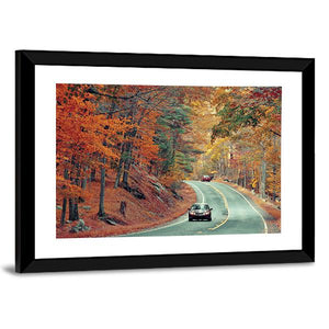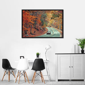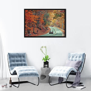 A realistic landscape of a winding road through fall foliage with two cars, rendered in warm oranges, greens, browns and touches of gray. The composition uses perspective and the rule of thirds to create depth and a peaceful, scenic autumnal atmosphere, ideal for living rooms or travel-themed room decor.