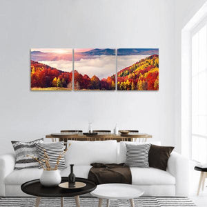 This panoramic canvas depicts the Carpathian Mountains with autumn foliage, a sea of clouds and warm sunlight. Photorealistic detail and a palette of reds, yellows, oranges, blues and whites create a serene yet vibrant atmosphere. Works well in modern or nature-inspired rooms as a landscape focal point.