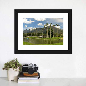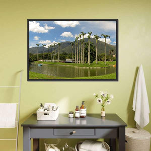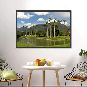 This panoramic canvas captures tall, slender palm trees beside a calm lake with two small boats and distant mountains in photorealistic detail. The scene reads serene, natural, and vibrantly green and blue—a daylight summer landscape. Works well in modern or nature-inspired rooms as understated wall decor.