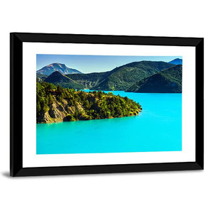 A panoramic canvas of Lac de la Castillon, France, capturing a turquoise lake ringed by lush green trees, rocky island terrain, and distant mountains. The photorealistic scene feels serene and vibrant with clear daytime light and picturesque colors. Suits modern room decor — a calm focal piece for living rooms or office walls.