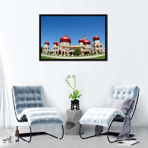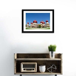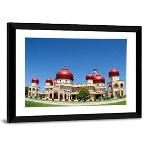Baitul Makmur Meulaboh Mosque panoramic canvas captures the mosque’s symmetrical architecture with ornate red domes, arched entrances, and green foliage beneath a clear, sunny sky. Rendered in a realistic style with red, beige, blue, and green tones, it gives a grand, majestic mood that works well in modern living rooms or quiet prayer spaces.