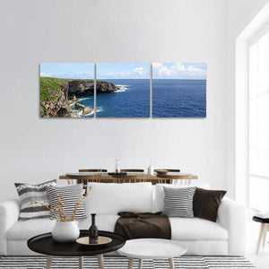 Banzai Cliff, Saipan presents a panoramic view of coastal cliffs, deep blue ocean, and a partly cloudy sky. This realistic nature photograph feels serene and vast, with rocky cliffs, green vegetation, and waves breaking at the base. It fits well in modern or coastal-inspired living spaces as a calm focal piece.