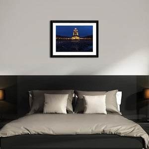 A panoramic canvas showing a lit military tower in Germany, rendered with realistic architectural detail. Blue, gold, gray, and white tones create a grand, somber historic night scene that fits modern or historic-inspired rooms.
