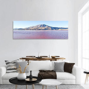A panoramic view of a pink lake framed by snow-capped and distant mountains. The photorealistic print highlights rippled water, snow patches and a clear blue sky, creating a serene, majestic mood that works well in modern or nature-inspired rooms.