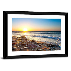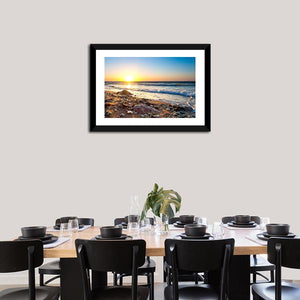 A serene, warm seascape of a beach and ocean at sunset, with waves crashing along a rocky shore beneath a low sun. The horizontal panorama uses orange, blue, gold and brown tones for a calm, realistic feel. It suits modern or coastal-inspired rooms as a quiet, natural wall accent.