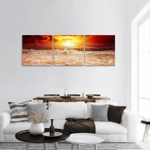 An ocean sunset panorama featuring fiery clouds and foamy waves in a warm red, orange, yellow and white palette. The composition carries a dramatic, intense yet serene mood and works well in modern or coastal room decor as a striking focal piece.