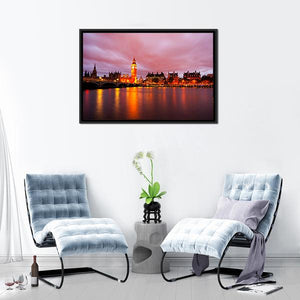 Featuring London’s Elizabeth Tower (Big Ben) and the Houses of Parliament along the River Thames, this panoramic canvas captures a photorealistic evening cityscape. Warm orange, pink and purple tones with lights reflecting on the water and clouds in the sky create a dramatic, serene, romantic mood. Works well in modern living rooms or other room decor that highlights city views.