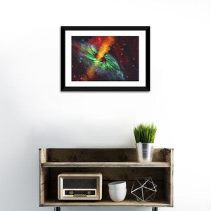 This panoramic canvas shows a black hole set within a dynamic, swirling nebula of cosmic dust and stars. A vibrant green-and-yellow vortex is balanced by red and dark outer regions and scattered white stars, creating an awe-inspiring, cosmic atmosphere that fits modern rooms.