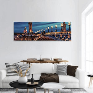 A panoramic view of the Alexandre III bridge in Paris, showing ornate lampposts, arched spans and a domed building rendered in photorealistic detail. Rich blues and golds give the scene a luminous, romantic mood that works well in modern or Parisian-inspired interiors as a focal wall piece.