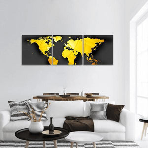 A yellow world map rendered in an abstract, geometric style with a bold, graphic mood. Faceted continents with sharp edges and a subtle shadow add depth in yellow, gold, black, and grey, making this piece well suited to contemporary living rooms and offices.