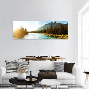 Castle Mountain panoramic canvas shows a sunlit mountain scene with a flowing river, forested slopes, and a subtle lens flare. The panoramic composition and natural palette of blues, greens, browns, yellows, and white create a serene, bright, and majestic atmosphere. Suited to nature-inspired rooms or modern wall decor.