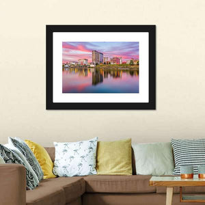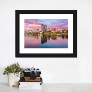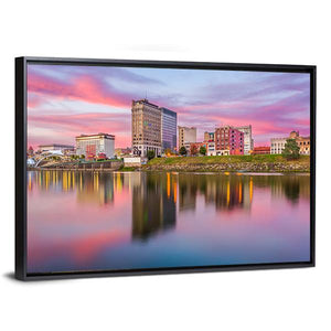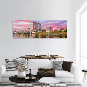 This panoramic canvas captures the Charleston downtown skyline with river, bridge, and varied buildings beneath a pink and purple sunset. The scene feels vibrant yet tranquil, with soft reflections in the water that suit modern living rooms and offices.