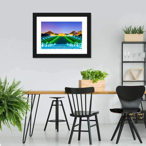 Depicts Chiang Kai Shek Memorial Hall in Taiwan, set against the surrounding city skyline and traditional architecture. Rendered realistically with a vibrant palette of blue, purple, green, yellow and orange to convey a grand, illuminated nighttime scene. Suits modern, colorful living rooms or office walls as a bold focal piece.