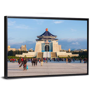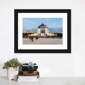 A photorealistic panoramic view of Chiang Kai Shek Memorial Hall in Taipei, focusing on the monument’s symmetrical architecture, traditional roof details, and wide staircase. Rendered in calm blues, whites, and golds, the print carries a grand, serene, historical mood and fits modern or minimalist rooms like living rooms and offices.