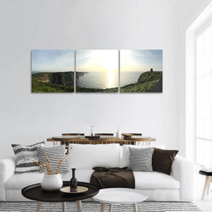 Moher Cliffs Ireland Panoramic Canvas places the Cliffs of Moher and the ocean at sunset in a serene, photo-realistic panorama. The blue, green, yellow, and gray palette reads bright and vast, a calm coastal focal point for modern or coastal living rooms and bedrooms.