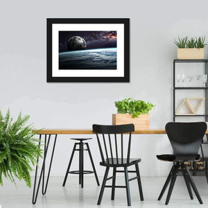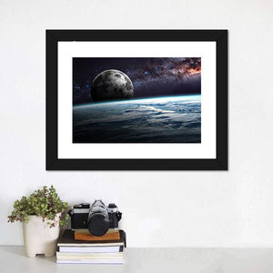 This panoramic close-up of the moon, Earth and the Milky Way presents a vast, serene cosmic scene in blues, blacks, whites, orange and purple. The modern, realistic space-art style suits contemporary living spaces and room decor with an astronomical or modern theme.