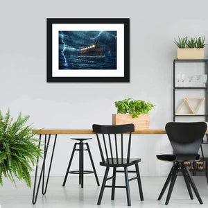 Noah's Ark Panoramic Canvas Wall Art depicts Noah's Ark amid a stormy night, with heavy rain, bolts of lightning, and illuminated windows on the vessel. The realistic scene uses deep blues, dark grays, and hints of yellow to create a dramatic, ominous atmosphere. It suits modern or nautical-themed rooms as a striking wall display.
