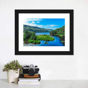 A panoramic view of a lake in the Scottish Highlands, framed by dense green forest and distant mountains beneath a clear blue sky. The naturalistic, peaceful scene—calm blue water and white clouds—works well in modern living rooms or studies that favor serene landscape art.