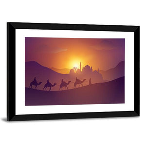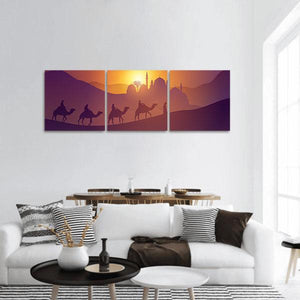 This panoramic canvas captures a serene desert scene at sunset, featuring silhouettes of camels and a beautiful mosque. The combination of purple, orange, and yellow hues creates an adventurous atmosphere, perfect for adding a touch of mystique to your decor.