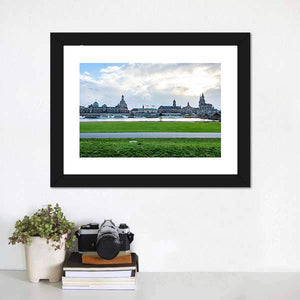 Dresden Cityscape Panoramic Canvas depicts the riverfront skyline with domed historic buildings, bridges and boats in a realistic panoramic scene. Soft blues, greens, whites and warm browns give the daytime view a serene, calming mood. It suits modern interiors and adds quiet scenic interest to a wall.
